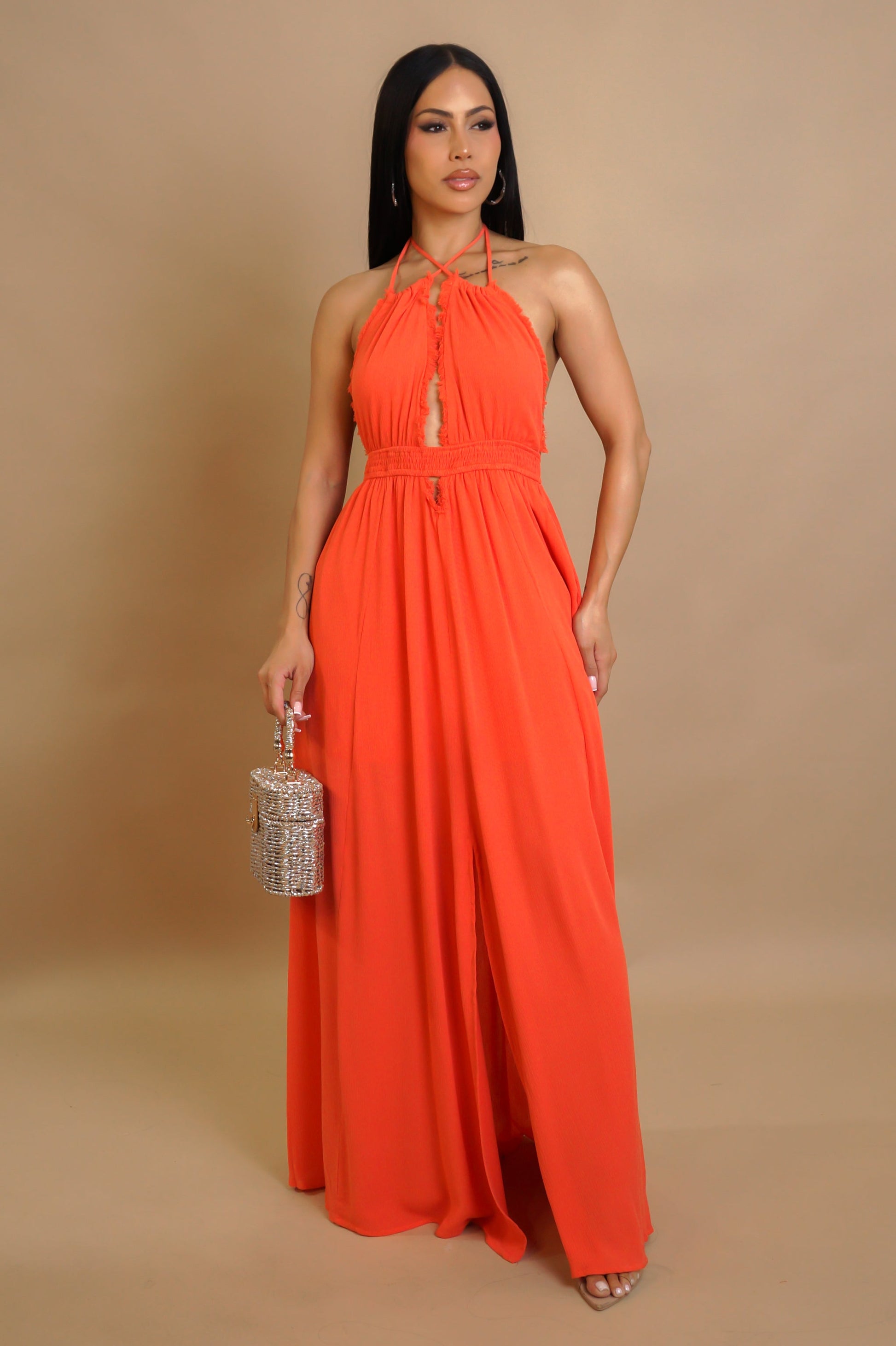 Adoptez une allure estivale et élégante avec cette robe longue fluide orange vif. Son col halter froncé met en valeur les épaules, tandis que sa coupe empire est soulignée par une taille ajustée et smockée. Le dos ouvert, orné d'un lien à pampilles, apporte une touche de légèreté. Parfaite pour un look de vacances décontracté.
