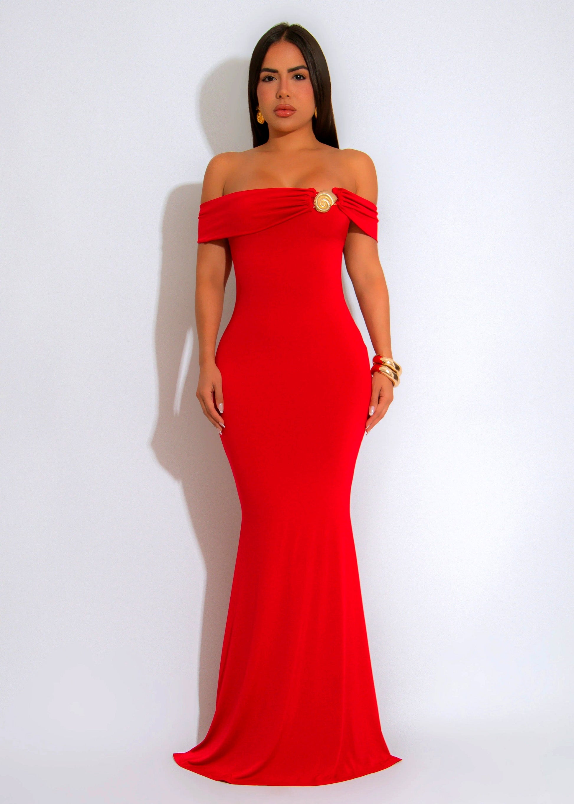 Faites sensation avec cette robe longue rouge écarlate, une pièce d'exception pour vos soirées. Confectionnée dans un tissu fluide et élégant, elle arbore un décolleté épaules dénudées qui sublime le buste. Une broche dorée ornée d'un motif en spirale vient délicatement froncer le tissu à l'épaule, ajoutant une touche sophistiquée. La coupe fourreau met en valeur la silhouette jusqu'aux pieds, tandis que le dos est agrémenté d'une découpe élégante. Idéale pour les galas ou les événements spéciaux.