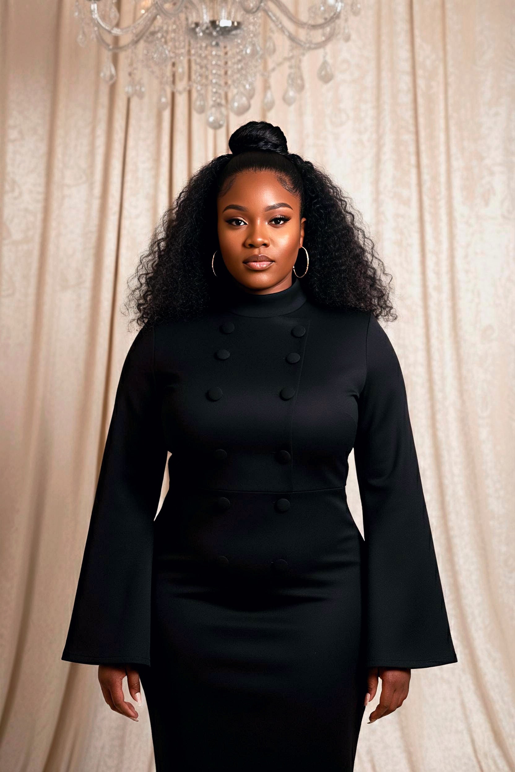 Cette robe est une pièce de soirée ou de travail chic qui emprunte des éléments militaires et dramatiques.