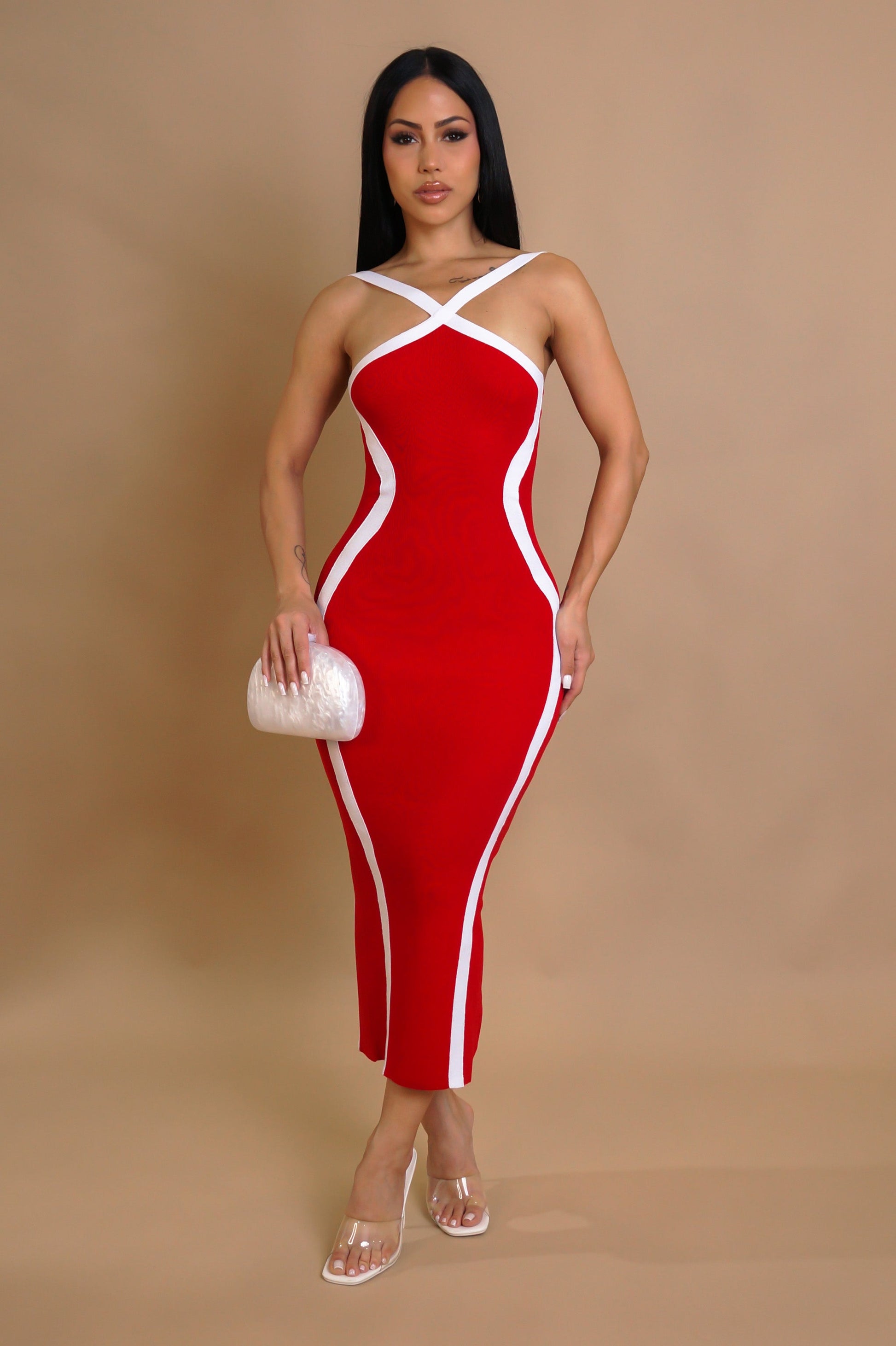 Découvrez notre robe midi ajustée, un essentiel pour une silhouette sculpturale et élégante. Confectionnée dans un tissu bandage de couleur rouge vif, elle est rehaussée de bandes contrastantes blanches qui épousent et subliment les courbes du corps. Les bretelles croisées sur le devant ajoutent une touche d'originalité et de sophistication. Cette robe présente également une fente discrète à l'arrière pour faciliter les mouvements et offrir une allure glamour. Idéale pour une soirée ou un événement spécial.