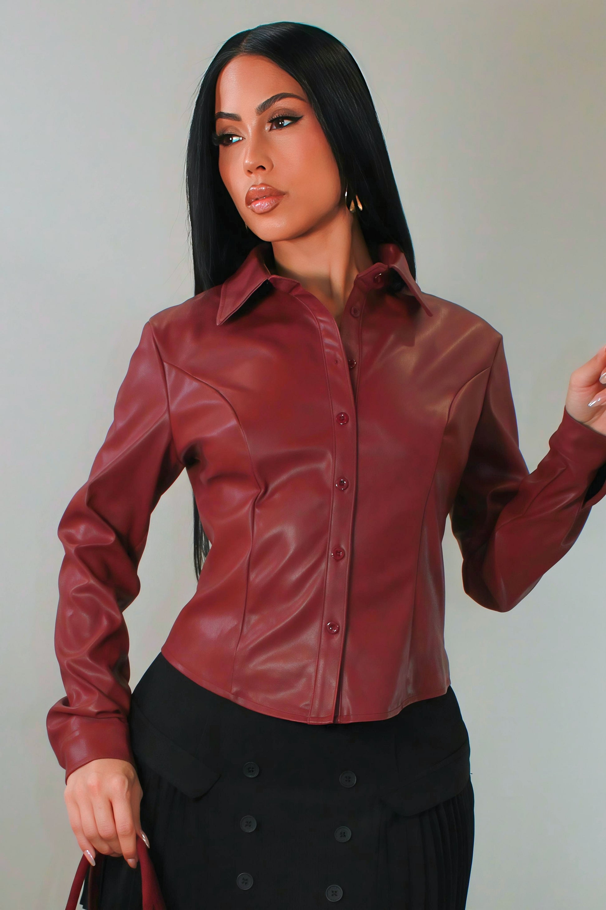 Chemise à manches longues confectionnée en similicuir souple de couleur bordeaux. Elle présente une coupe ajustée et un col classique, offrant une allure audacieuse et moderne. Idéale à porter avec un pantalon taille haute ou une jupe crayon.